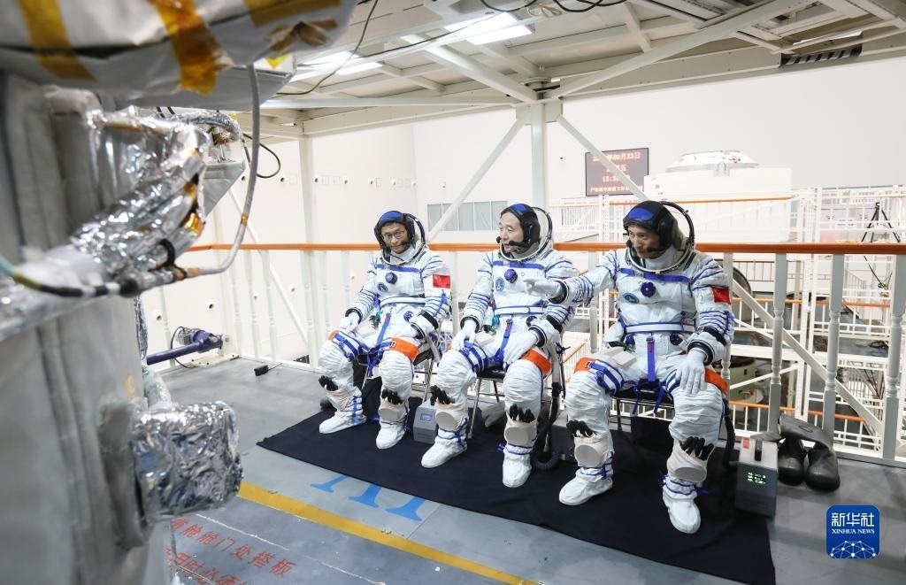 神舟十六號(hào)航天員乘組在人船合練中交流(2022年9月23日攝)。新華社發(fā)(徐部 攝)