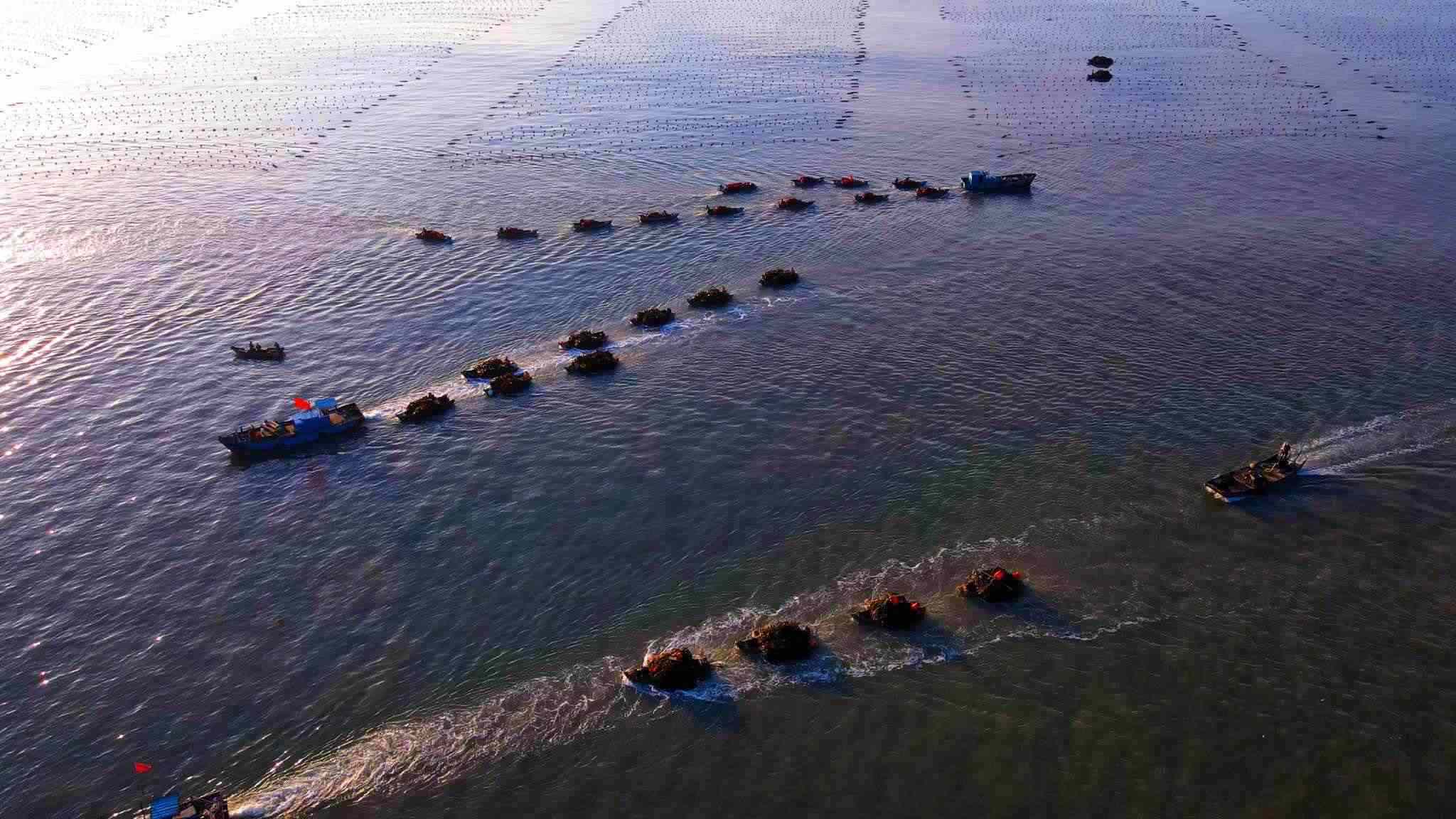 山東威海:漁民駕船收獲海帶