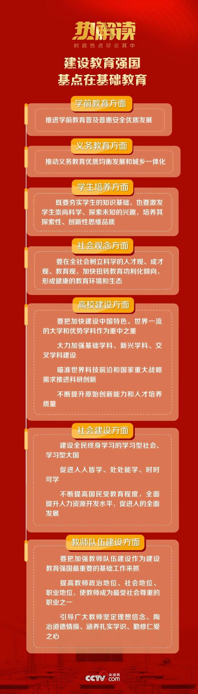 學前教育普及普惠安全優(yōu)質(zhì)發(fā)展;義務教育優(yōu)質(zhì)均衡發(fā)展和城鄉(xiāng)一體化;在全社會樹立科學的人才觀、成才觀、教育觀……這些始終是總書記關(guān)心的重點。做什么、怎么做,總書記明確給出了推動基礎(chǔ)教育、加快建設(shè)高質(zhì)量教育體系的方法路徑。