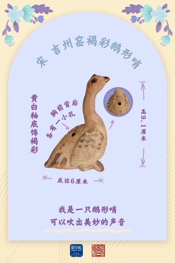 鵝形哨出土于江西吉安的宋代吉州窯遺址。吉安市博物館館長李希朗說,吉州窯的瓷土粗松,有近似于陶的特點,可塑性較強。這里出土的瓷塑大多不超過10厘米,動物瓷塑的原型多為社會生活中所常見。從出土的瓷塑數量來看,吉州窯當年的訂單量很大,頗受市場歡迎。也許每一只鵝形哨的背后,都有一名鼓著腮幫子的稚童。歷經時光荏苒,鵝形哨到今天還能發(fā)出動聽的哨音。