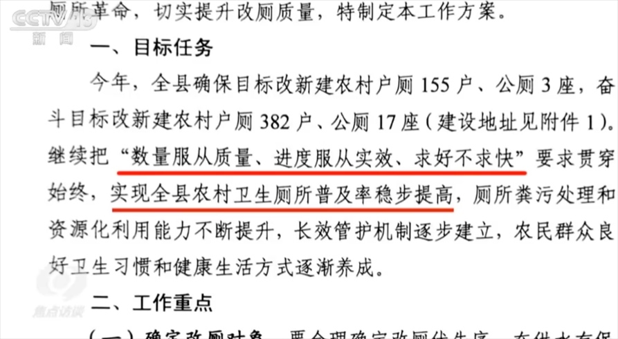 央視網(wǎng)消息(焦點(diǎn)訪談):“小廁所、大民生”。廁所問(wèn)題不僅關(guān)系農(nóng)村人居環(huán)境的改善,也關(guān)系廣大人民群眾生活品質(zhì)的提升。目前,全國(guó)農(nóng)村衛(wèi)生廁所普及率超過(guò)73%,“廁所革命”走向縱深。然而,記者在調(diào)查中發(fā)現(xiàn),有些地區(qū)的廁改成績(jī)很“亮眼”,廁改成效卻很“扎眼”,這關(guān)乎百姓切身利益的大事兒,要經(jīng)得起“回頭看”、再檢驗(yàn)。