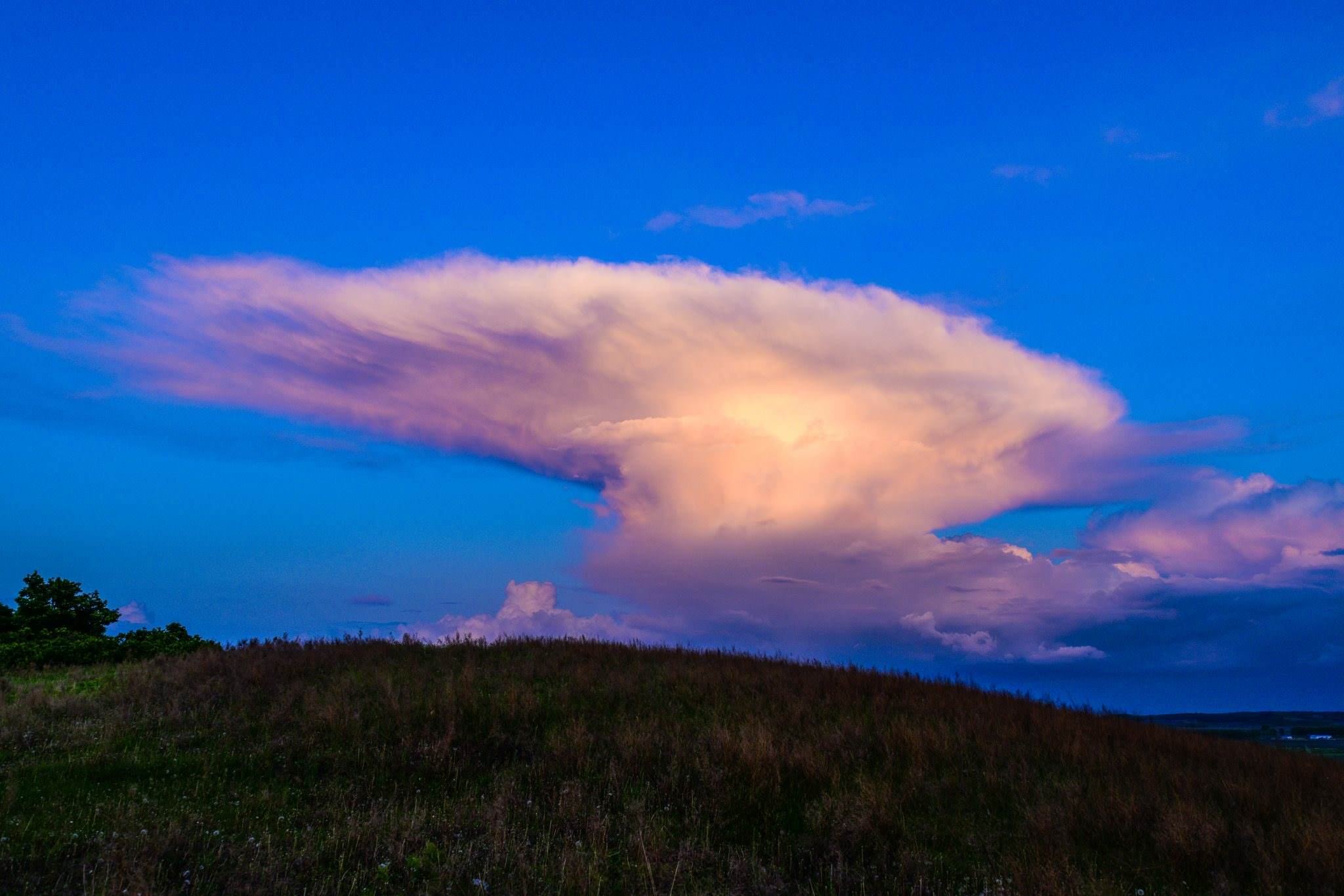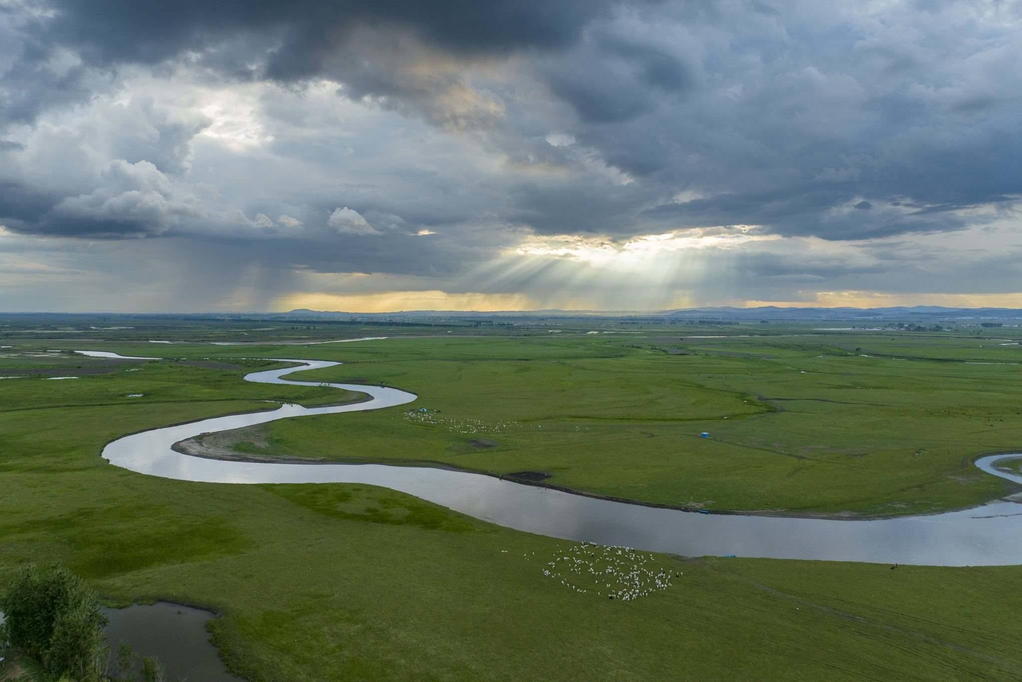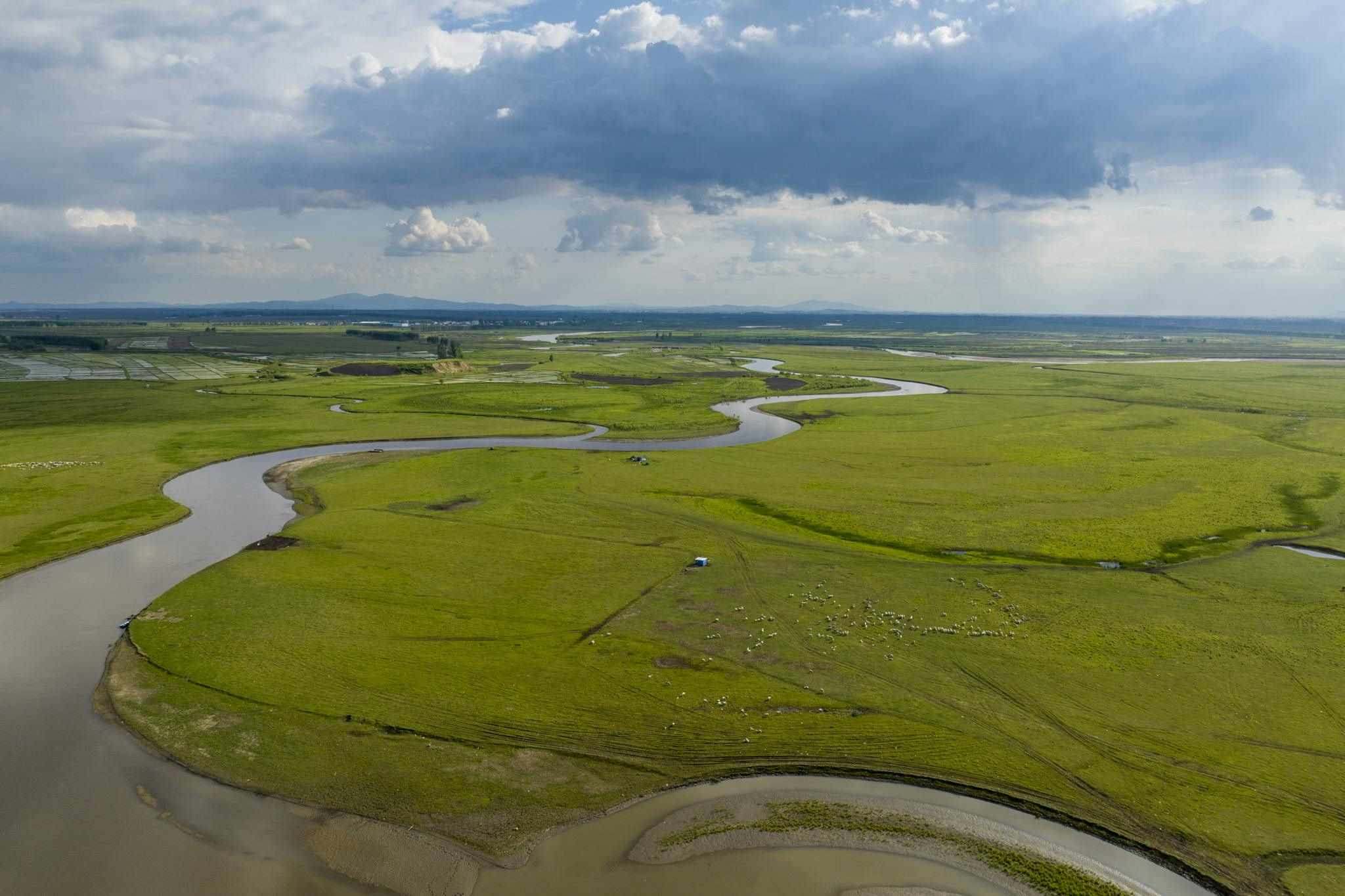 2023年6月2日傍晚,黑龍江雞西,在密山境內(nèi)的穆棱河流域上空云景變幻,河套草原景色秀美。視覺中國