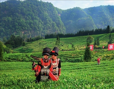 四川省小涼山地區(qū)的樂(lè)山市馬邊彝族自治縣福來(lái)村,身著傳統(tǒng)彝族服飾的工作人員用手機(jī)直播采茶(2022 年 4月 27 日攝)唐文豪攝 / 本刊