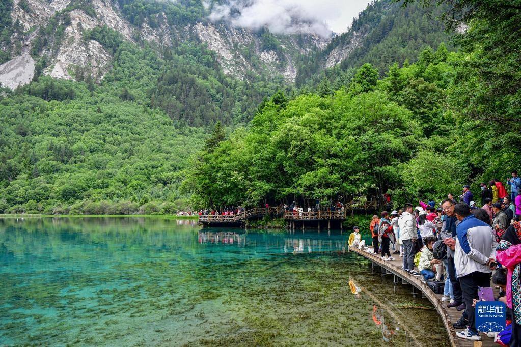 九寨溝景區(qū)五花海景點(diǎn)人流如織(6月7日攝)。