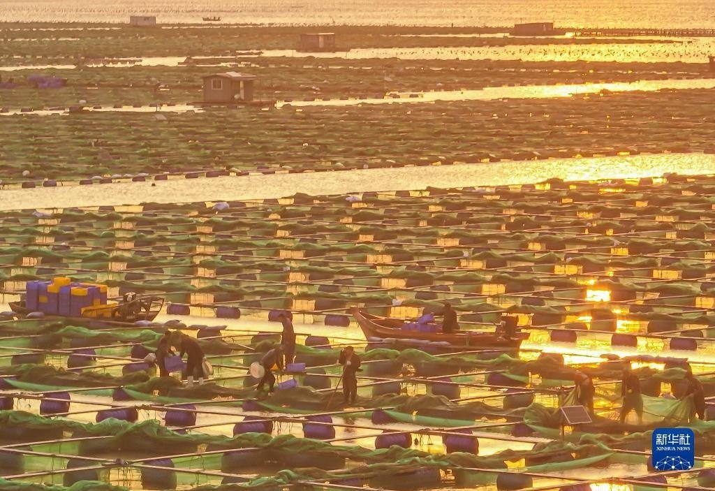 6月5日,在榮成市石島管理區(qū)桑溝灣海洋牧場生態(tài)網箱養(yǎng)殖區(qū),漁民在進行海上養(yǎng)殖作業(yè)(無人機照片)。