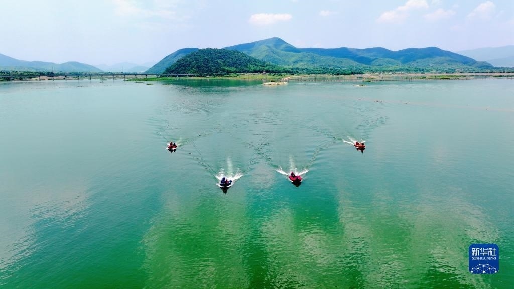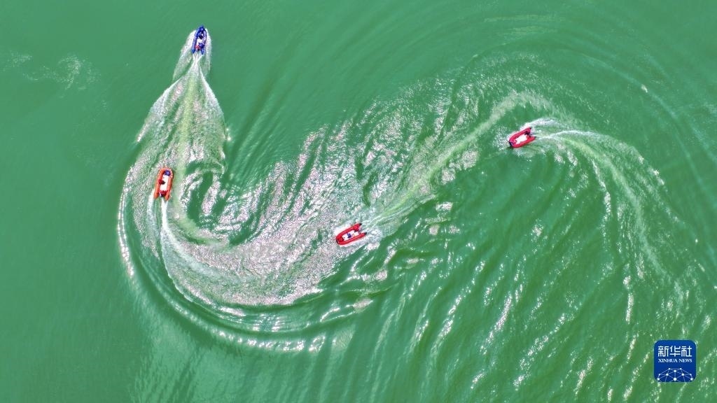 當(dāng)日,在浙江省湖州市長(zhǎng)興縣合溪水庫(kù)煤山段,煤山鎮(zhèn)組織黨員干部、應(yīng)急管理隊(duì)員、志愿者組成應(yīng)急救援隊(duì),開(kāi)展防汛減災(zāi)應(yīng)急綜合實(shí)戰(zhàn)演練,通過(guò)沖鋒舟編隊(duì)、水上打撈、水上救援等課目訓(xùn)練,增強(qiáng)防汛應(yīng)急處置和水上搶險(xiǎn)救災(zāi)能力。新華社發(fā)(許旭 攝)