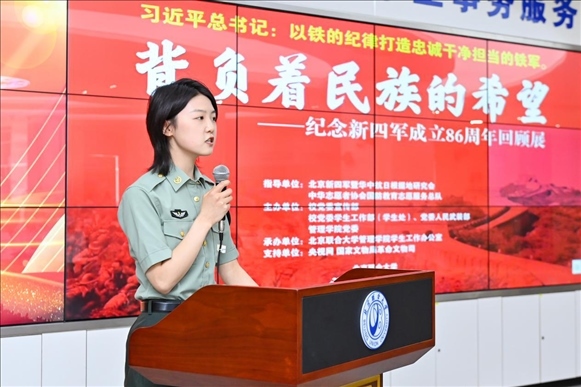 為深入學(xué)習(xí)貫徹習(xí)近平新時代中國特色社會主義思想主題教育,落實(shí)習(xí)近平加強(qiáng)全民國防教育的重要指示精神,弘揚(yáng)愛國主義精神、增強(qiáng)全民國防意識,推動全民國防教育進(jìn)校園,深化學(xué)?!按笏颊n”建設(shè),6月9日,由北京新四軍暨華中抗日根據(jù)地研究會、中華志愿者協(xié)會國防教育志愿服務(wù)總隊(duì)指導(dǎo),北京聯(lián)合大學(xué)黨委學(xué)生工作部(學(xué)生處)、黨委人民武裝部、黨委宣傳部、北京聯(lián)合大學(xué)新時代文明實(shí)踐中心建設(shè)規(guī)劃研究所、管理學(xué)院黨委共同主辦,管理學(xué)院學(xué)生工作辦公室承辦的“背負(fù)民族希望——紀(jì)念新四軍成立86周年回顧展”大會在北四環(huán)校區(qū)學(xué)生事務(wù)大廳舉行。