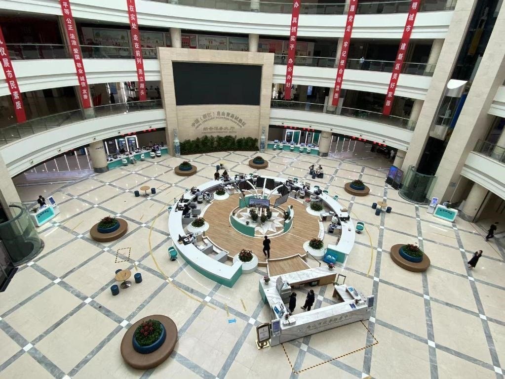 圖為浙江舟山的中國(guó)(浙江)自貿(mào)試驗(yàn)區(qū)綜合服務(wù)大廳。新華社記者魏一駿 攝