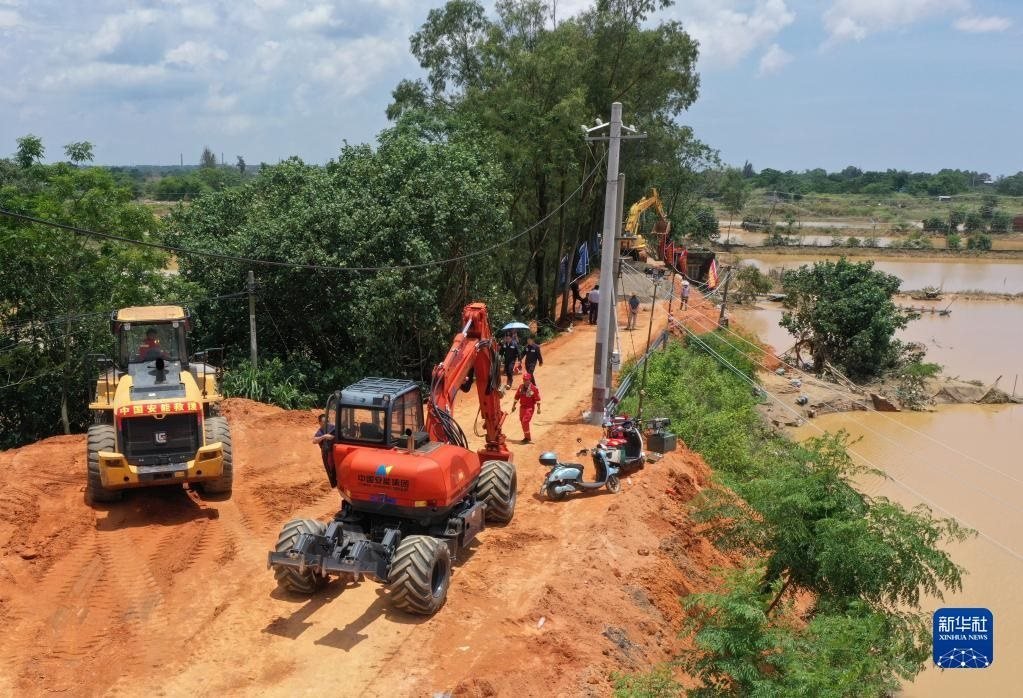 6月11日,在廣西合浦縣白沙鎮(zhèn),工人在施工修復遭洪水損毀的堤壩(無人機照片)。