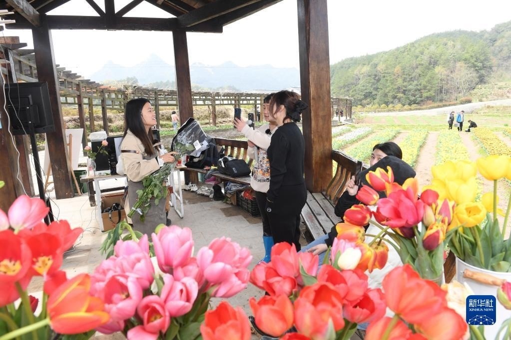 主播在浙江金華浦江縣杭坪鎮(zhèn)烏漿村的花海間直播賣花(3月28日攝)。新華社記者 翁忻旸 攝
