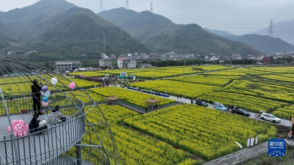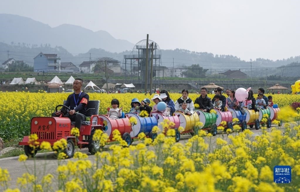 在浙江杭州臨安區(qū)青山湖街道郎家村“共富稻田”,游客乘坐田野小火車在油菜花地里感受春日美景(4月1日攝)?!肮哺坏咎铩倍ㄎ欢喙δ芴飯@農(nóng)旅綜合體,陸續(xù)打造了妙哉花園、稻田觀光道、稻田餐廳、稻田茶吧等鄉(xiāng)村旅游特色節(jié)點,吸引城市居民前來體驗戶外農(nóng)田生活。新華社記者 徐昱 攝