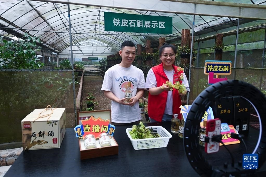 在浙江諸暨東白湖鎮(zhèn)的鐵皮石斛有機種植基地,東白湖鎮(zhèn)黨員志愿者(右)和基地負(fù)責(zé)人一起直播銷售鐵皮石斛花茶、鐵皮石斛酒等產(chǎn)品(6月8日攝)。近年來,東白湖鎮(zhèn)著力發(fā)展鐵皮石斛等特色農(nóng)業(yè)產(chǎn)業(yè),加快農(nóng)業(yè)數(shù)字化轉(zhuǎn)型,推進農(nóng)特產(chǎn)品交易服務(wù)中心、惠農(nóng)綜合平臺以及直播經(jīng)濟的發(fā)展。新華社記者 徐昱 攝