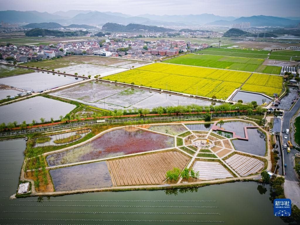浙江諸暨楓橋鎮(zhèn)杜黃新村農(nóng)耕體驗研學(xué)基地(無人機照片,3月29日攝)。近年來,當(dāng)?shù)赝瞥鍪喾N農(nóng)事特色體驗項目,著力打造“田上杜黃”這一文旅品牌。新華社記者 江漢 攝