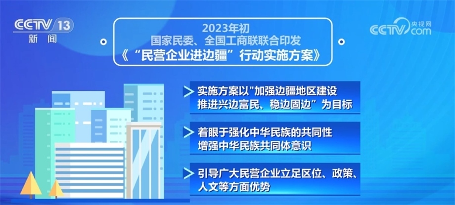 2023年初,國家民委、全國工商聯(lián)聯(lián)合印發(fā)了《“民營企業(yè)進邊疆”行動實施方案》,實施方案以“加強邊疆地區(qū)建設,推進興邊富民、穩(wěn)邊固邊”為目標,著眼于強化中華民族的共同性、增強中華民族共同體意識,引導廣大民營企業(yè)立足區(qū)位、政策、人文等方面優(yōu)勢,積極參與邊疆地區(qū)基礎設施建設,助力邊疆地區(qū)提升資源轉(zhuǎn)化能力,推動邊疆地區(qū)融入全國統(tǒng)一大市場,促進邊疆各民族交往交流交融,共同走向社會主義現(xiàn)代化,實現(xiàn)共同富裕。