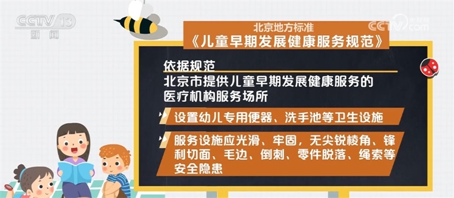 依據(jù)規(guī)范,北京市提供兒童早期發(fā)展健康服務(wù)的醫(yī)療機(jī)構(gòu)服務(wù)場(chǎng)所應(yīng)遠(yuǎn)離各種污染源,采光充足,通風(fēng)良好,遠(yuǎn)離噪聲與電磁干擾;設(shè)置防蚊、蟲、蠅、鼠等設(shè)備,并放置于兒童無法接觸到的地方;室內(nèi)空氣溫度、濕度、化學(xué)性、生物性及放射性物質(zhì)濃度應(yīng)符合相關(guān)要求。應(yīng)設(shè)置哺乳室,面積不少于10平方米;設(shè)置幼兒專用便器、洗手池等衛(wèi)生設(shè)施;服務(wù)設(shè)施應(yīng)光滑、牢固,無尖銳棱角、鋒利切面、毛邊、倒刺、零件脫落、繩索等安全隱患。