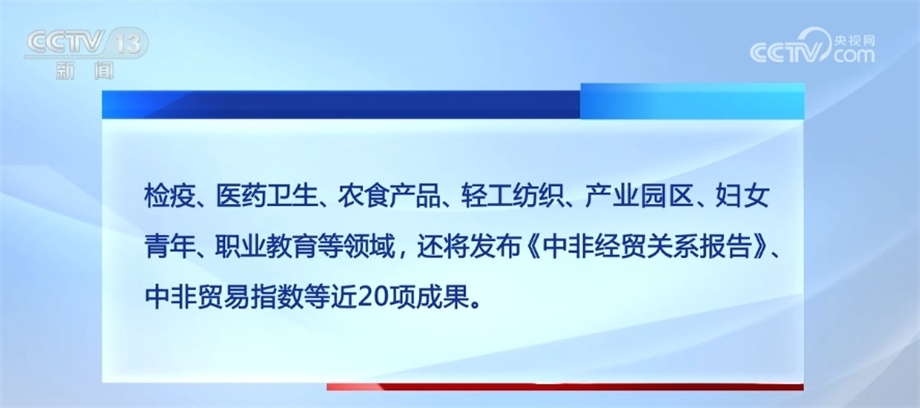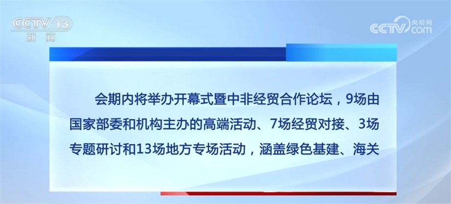 會期內(nèi)將舉辦開幕式暨中非經(jīng)貿(mào)合作論壇,9場由國家部委和機(jī)構(gòu)主辦的高端活動、7場經(jīng)貿(mào)對接、3場專題研討和13場地方專場活動,涵蓋綠色基建、海關(guān)檢疫、醫(yī)藥衛(wèi)生、農(nóng)食產(chǎn)品、輕工紡織、產(chǎn)業(yè)園區(qū)、婦女青年、職業(yè)教育等領(lǐng)域,還將發(fā)布《中非經(jīng)貿(mào)關(guān)系報告》、中非貿(mào)易指數(shù)等近20項成果。