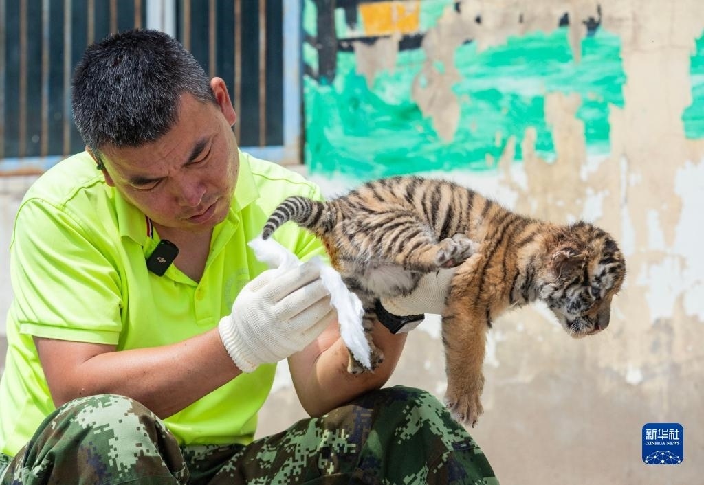 6月13日,在黑龍江東北虎林園的虎舍中,飼養(yǎng)員給東北虎幼崽測(cè)量體溫。