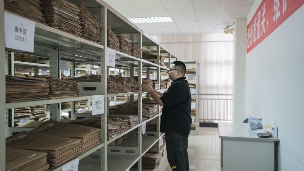 6月13日,在西南大學(xué)評卷點,工作人員將完成掃描后的高考答卷及答題卡裝入檔案袋集中管理。新華社記者李前磊 攝