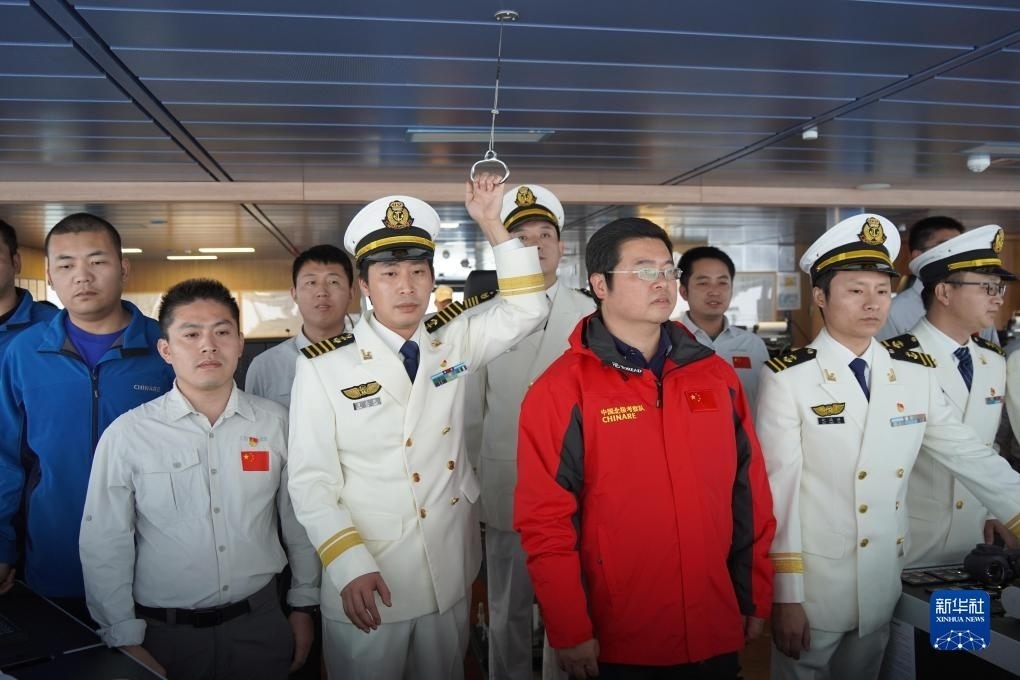報告聲響徹駕駛臺,“雪龍2”號船長肖志民旋即拉響汽笛。接著,“雪龍2”號停止前行,中國第13次北冰洋科學考察隊領隊王金輝走向廣播臺,通過全船廣播宣告——