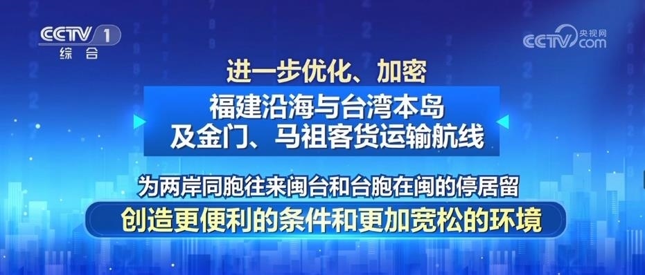二是進(jìn)一步優(yōu)化、加密福建沿海與臺灣本島及金門、馬祖客貨運(yùn)輸航線,為兩岸同胞往來閩臺和臺胞在閩的停居留,創(chuàng)造更便利的條件和更加寬松的環(huán)境。
