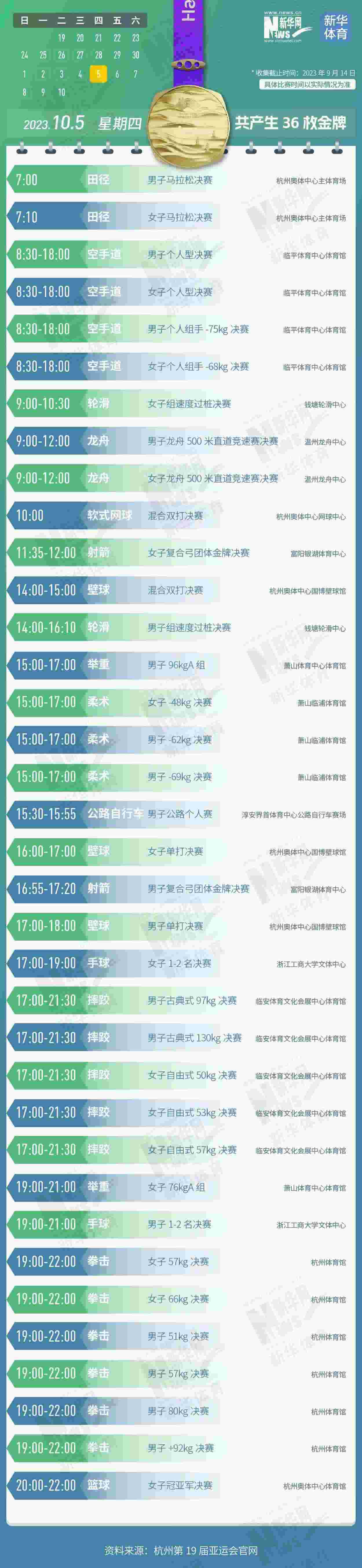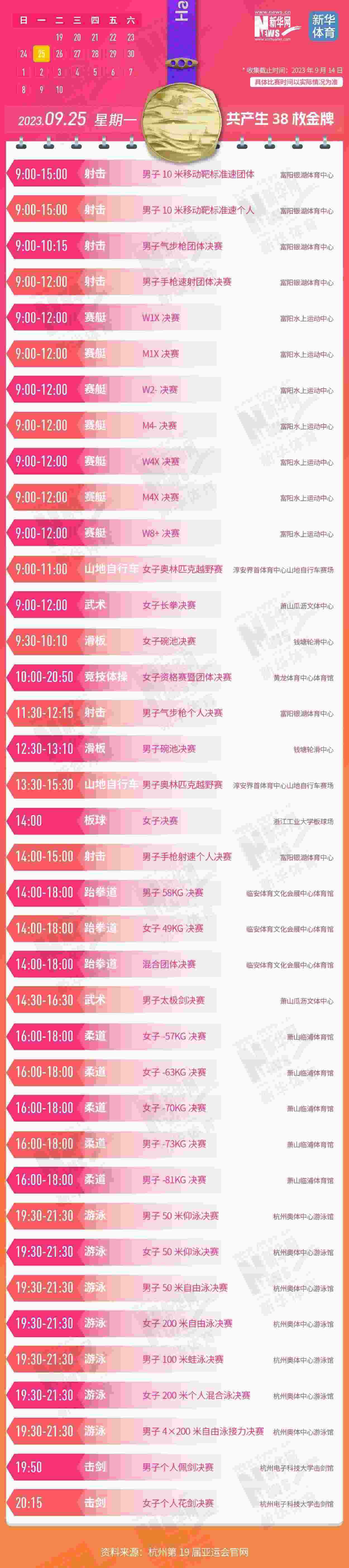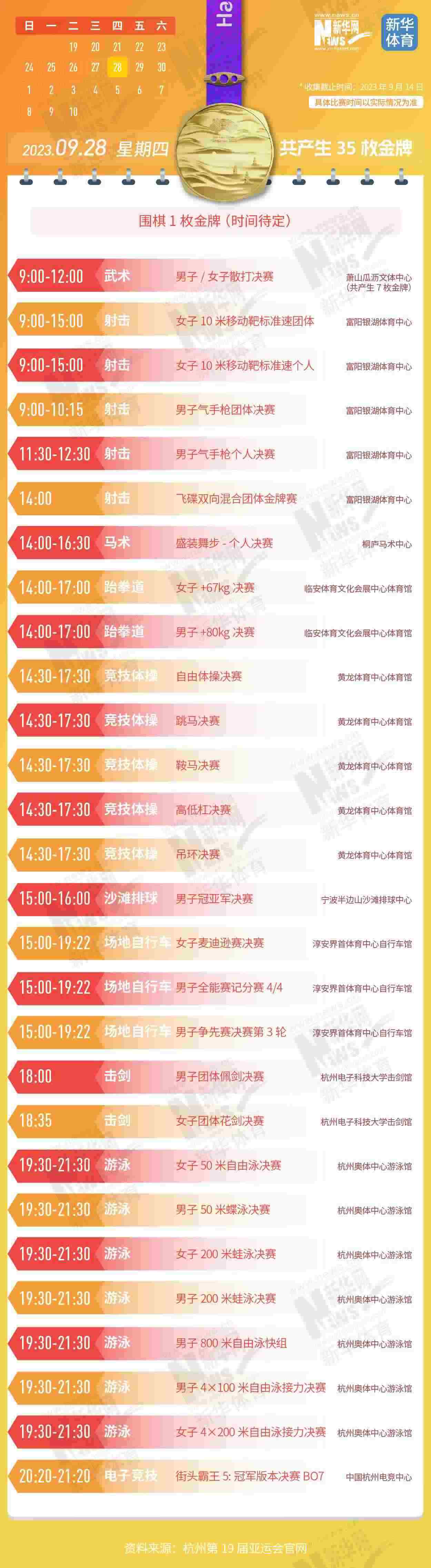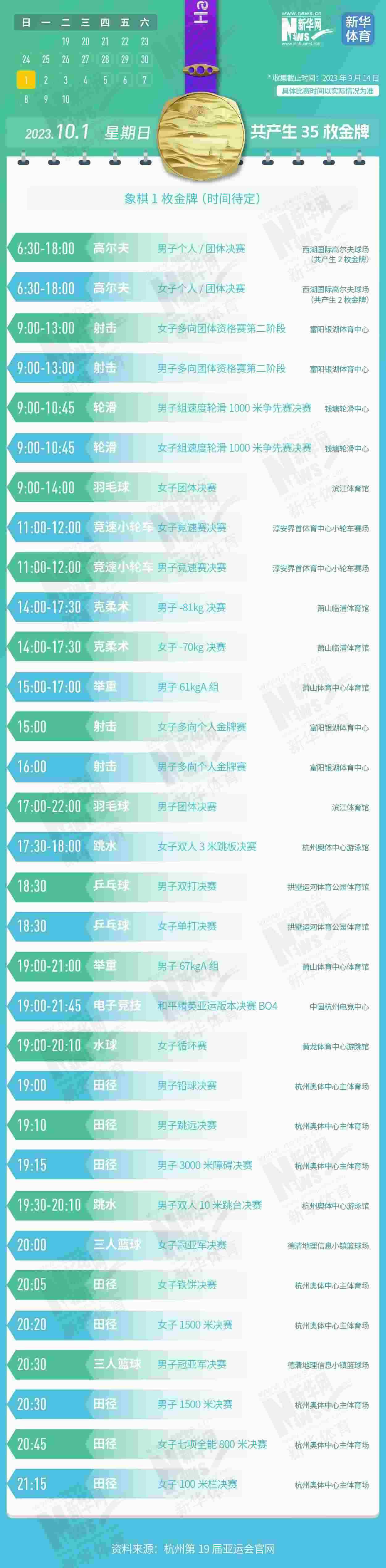 杭州第19屆亞運會即將開幕。本屆亞運會將產(chǎn)生481枚金牌,快收藏這份金牌賽事日歷,助你精準觀賽!