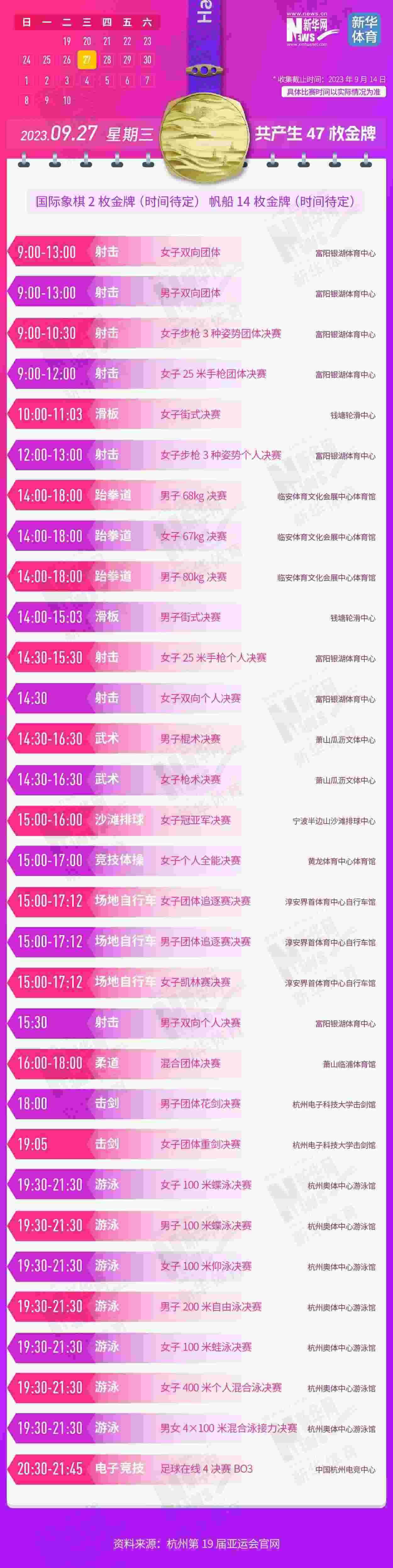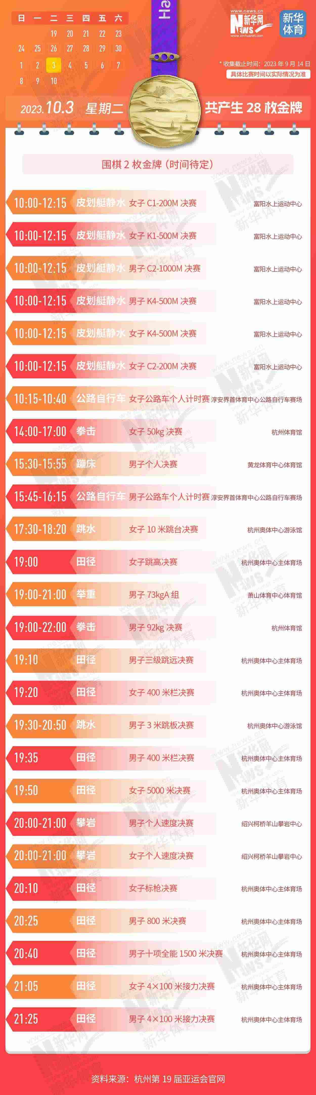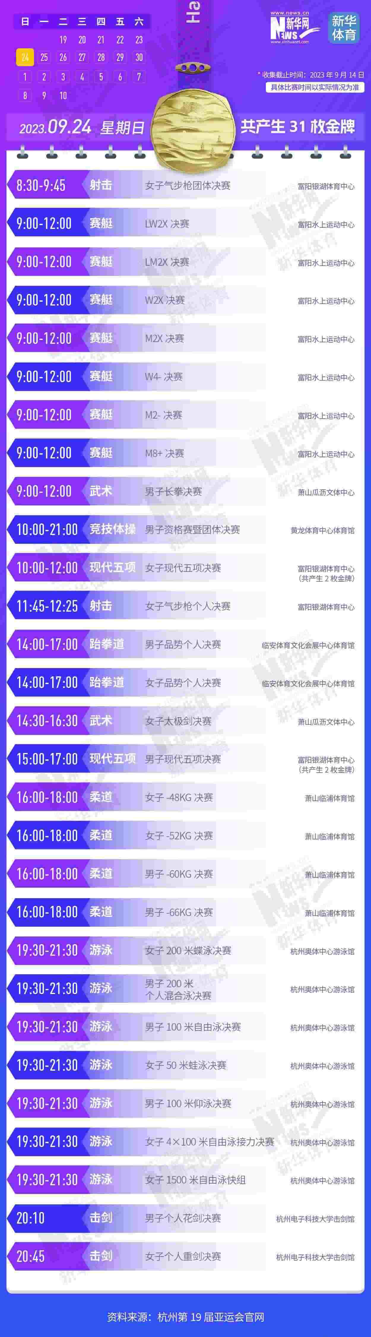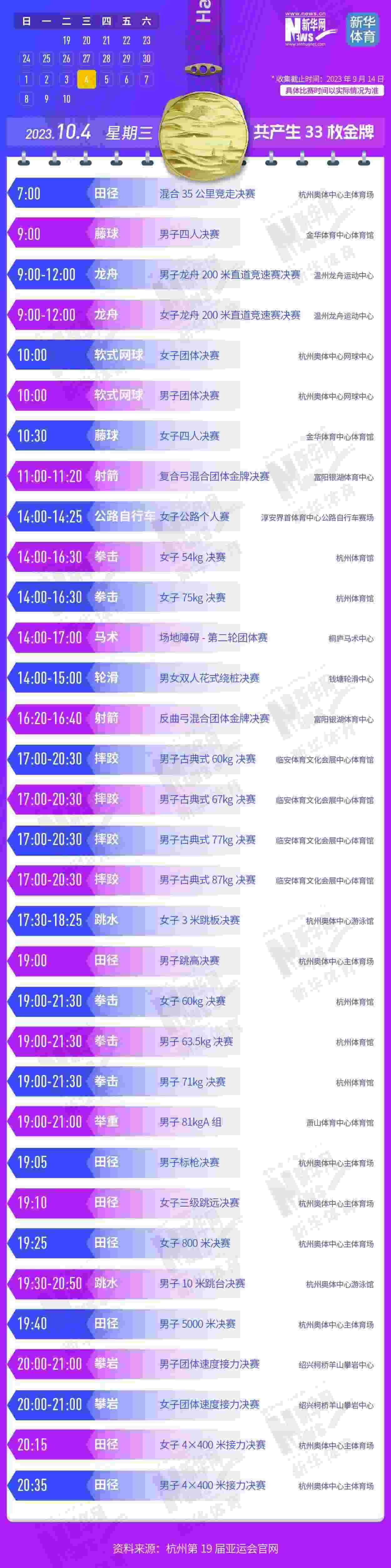 杭州第19屆亞運會即將開幕。本屆亞運會將產(chǎn)生481枚金牌,快收藏這份金牌賽事日歷,助你精準觀賽!