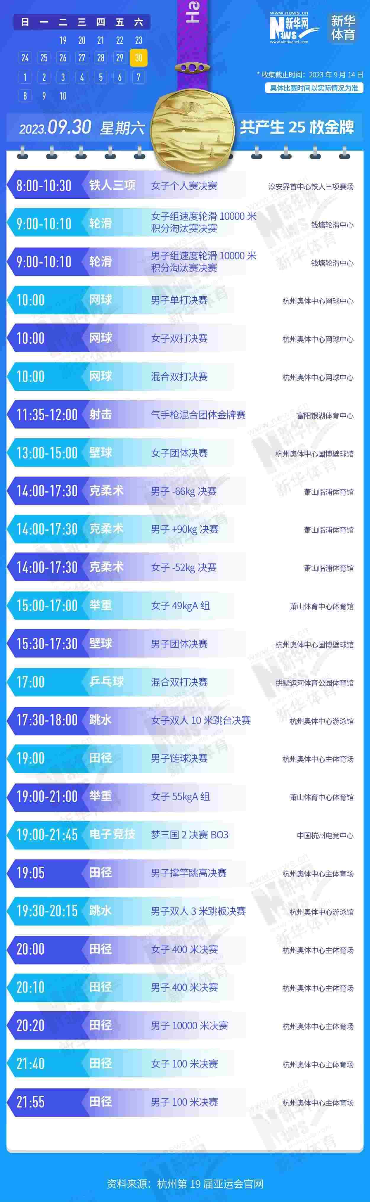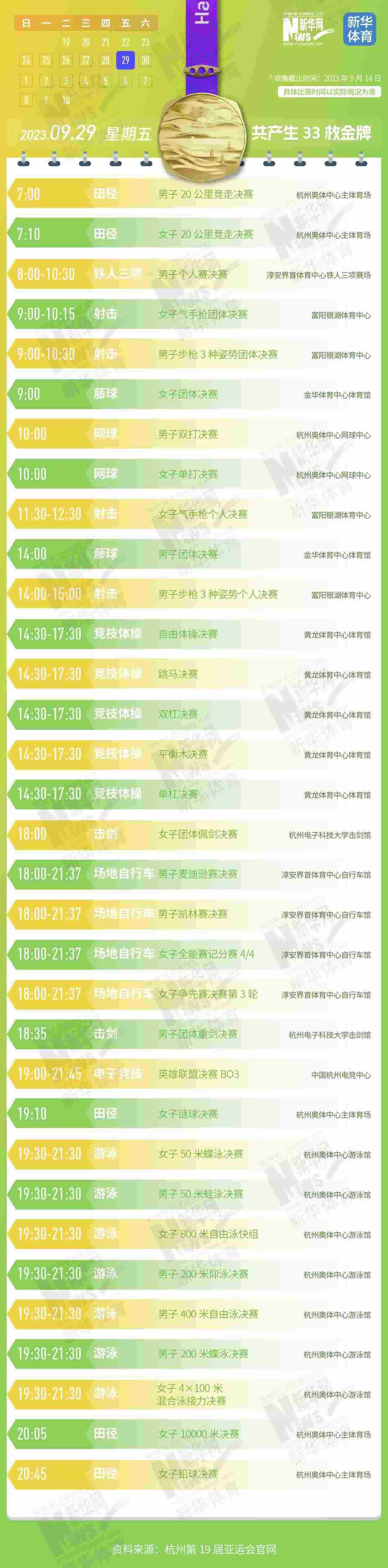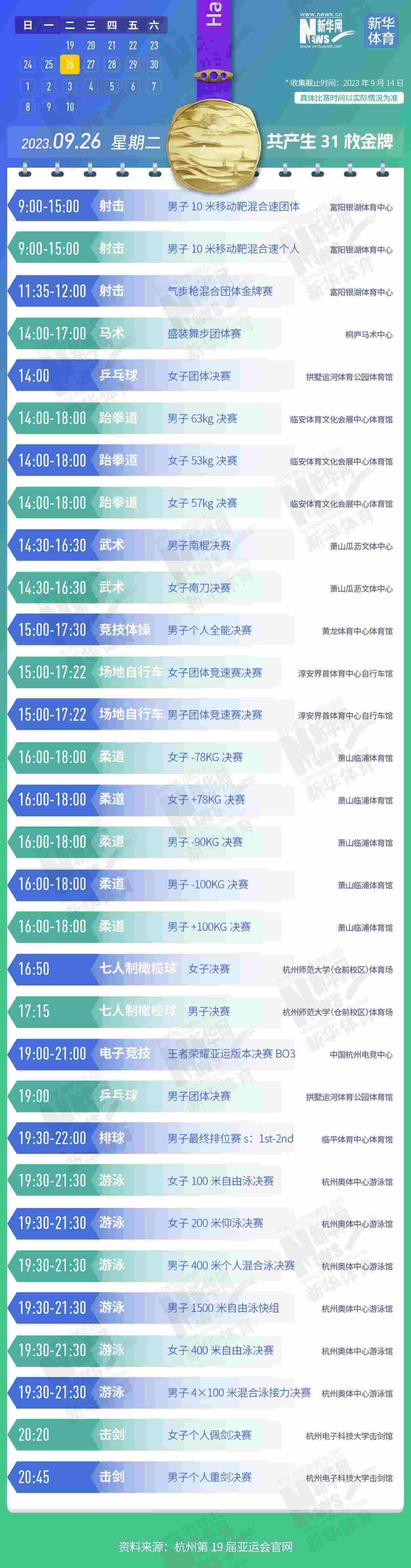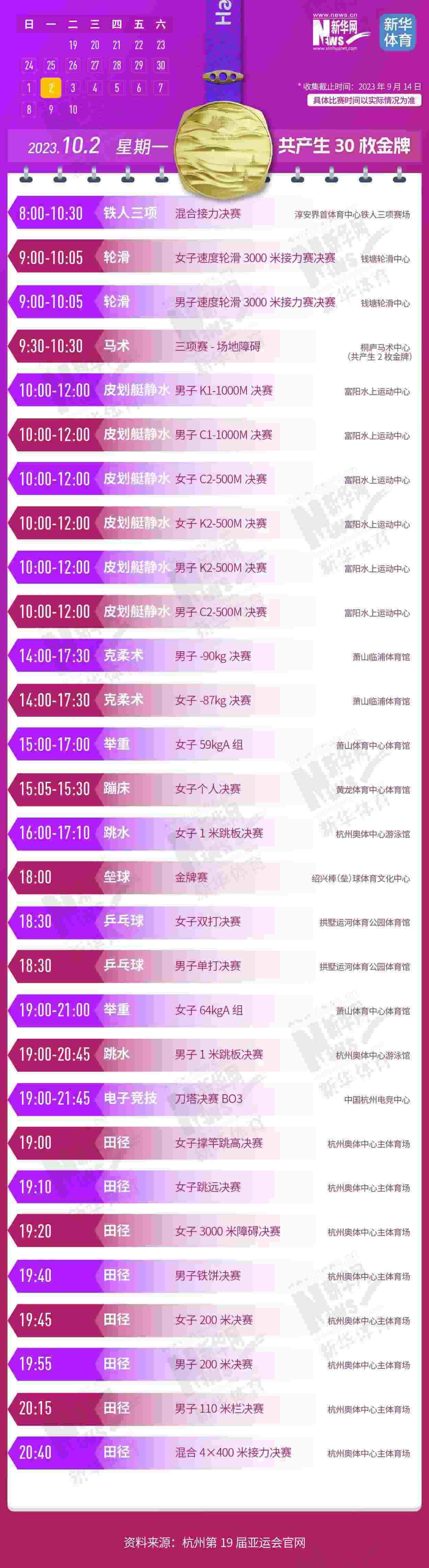 杭州第19屆亞運會即將開幕。本屆亞運會將產(chǎn)生481枚金牌,快收藏這份金牌賽事日歷,助你精準觀賽!