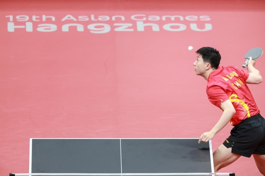 9月22日,中國(guó)隊(duì)選手馬龍?jiān)诒荣愔邪l(fā)球。新華社記者 劉續(xù) 攝