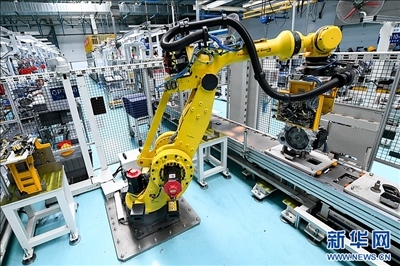 在位于哈爾濱市平房區(qū)哈爾濱東安汽車動力股份有限公司生產車間,工業(yè)機器人在生產作業(yè)。
