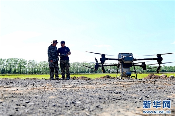 北大荒集團二九〇農場有限公司農技人員正指導種植戶使用無人機。