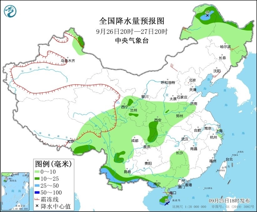 9月25日20時至26日20時,廣東西南部、廣西南部、海南島以及新疆北疆北部、西藏東南部、陜西南部等地部分地區(qū)有中到大雨,其中,海南島東部和南部等地部分地區(qū)有暴雨或大暴雨(100~180毫米)。另外,新疆阿勒泰山區(qū)有雨夾雪或雪。內(nèi)蒙古中西部、山東半島等地部分地區(qū)有4~6級風(fēng)(見圖1)。