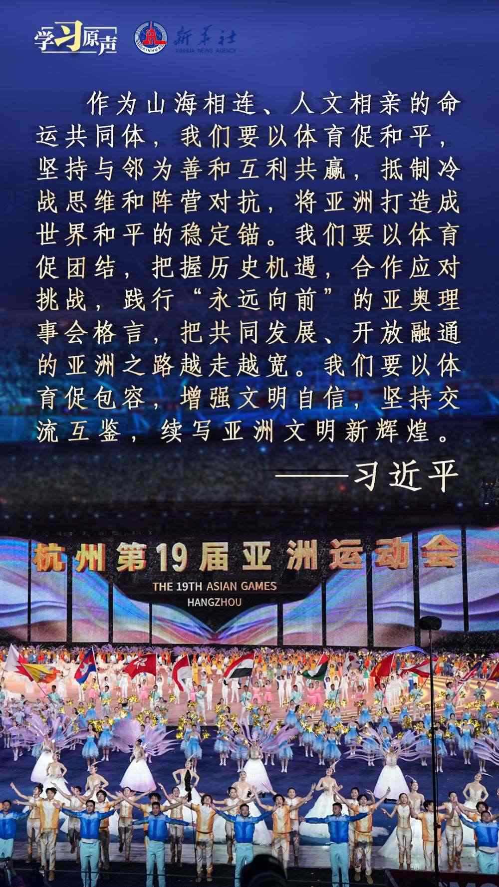 秋分時節(jié),舉世矚目的杭州第十九屆亞洲運動會隆重開幕。“亞洲運動會承載著亞洲人民對和平、團(tuán)結(jié)、包容的美好向往?!绷?xí)近平主席在杭州第十九屆亞洲運動會開幕式歡迎宴會上的致辭,傳遞著熱情友好的情誼,宣示了新時代中國推動亞洲大家庭團(tuán)結(jié)合作的堅定決心,為促進(jìn)亞洲和國際奧林匹克運動發(fā)展、共建亞洲命運共同體注入強大信心與力量。