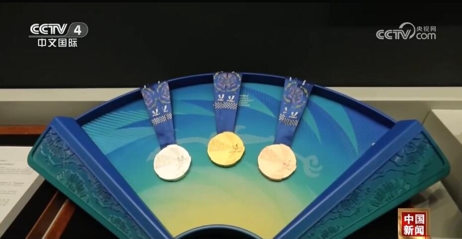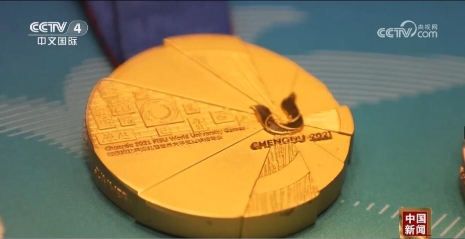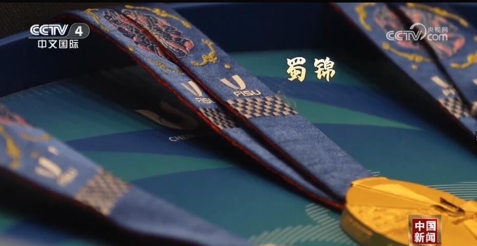 總臺(tái)記者 王豐:走進(jìn)成都大運(yùn)會(huì)博物館,最大的感受就是成都的元素?zé)o處不在。比如,我們剛一進(jìn)來,右手邊是成都大運(yùn)會(huì)的吉祥物蓉寶??赐耆貙殠鷣砜纯慈毓猓裁词侨毓饽??獎(jiǎng)牌代表了成都大運(yùn)會(huì)的榮譽(yù),“蓉”是取自成都的簡稱,包含了光榮和融合的含義,整個(gè)獎(jiǎng)牌的設(shè)計(jì)是呈現(xiàn)了不規(guī)則的圓形。另外,獎(jiǎng)牌的元素包含成都市的標(biāo)志——太陽神鳥。此外,在獎(jiǎng)牌的綬帶設(shè)計(jì)上首次采用了蜀錦的制作工藝,實(shí)際上也是非物質(zhì)文化遺產(chǎn)活化利用的非常好的案例。