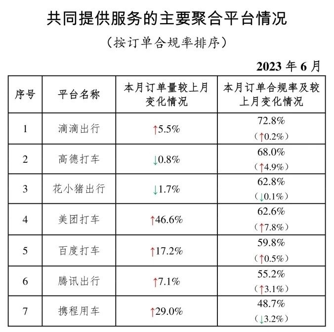 其中,面向乘客、與網(wǎng)約車平臺公司共同提供服務(wù)的平臺(俗稱“聚合平臺”)完成2.18億單,環(huán)比上升4.0%。按訂單合規(guī)率由高到低的分別是滴滴出行、高德打車、花小豬出行、美團(tuán)打車、百度打車、騰訊出行、攜程用車。