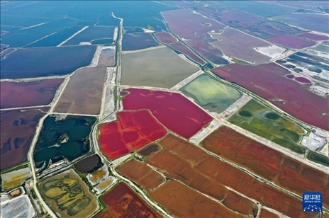 夏日時節(jié),隨著氣溫不斷升高,山西運城鹽湖呈現(xiàn)出色彩斑斕的景象。從空中俯瞰,猶如天然“調(diào)色盤”。