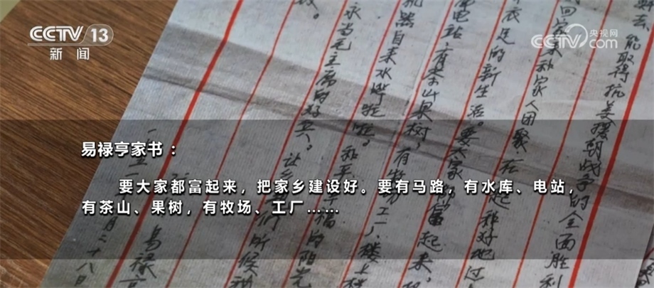 抱著與家人訣別的心情,年輕的易祿亨寫下了這封家書。除了戰(zhàn)場(chǎng)上的見聞和對(duì)家人的思念,他還寫下了對(duì)未來美好生活的憧憬:要大家都富起來,把家鄉(xiāng)建設(shè)好。要有馬路,有水庫(kù)、電站,有茶山果樹,有牧場(chǎng)、工廠……作為家中長(zhǎng)子,瞞著父母走上戰(zhàn)場(chǎng),易祿亨一直心懷愧疚。他希望通過這些文字,能讓父母理解自己的決定。
