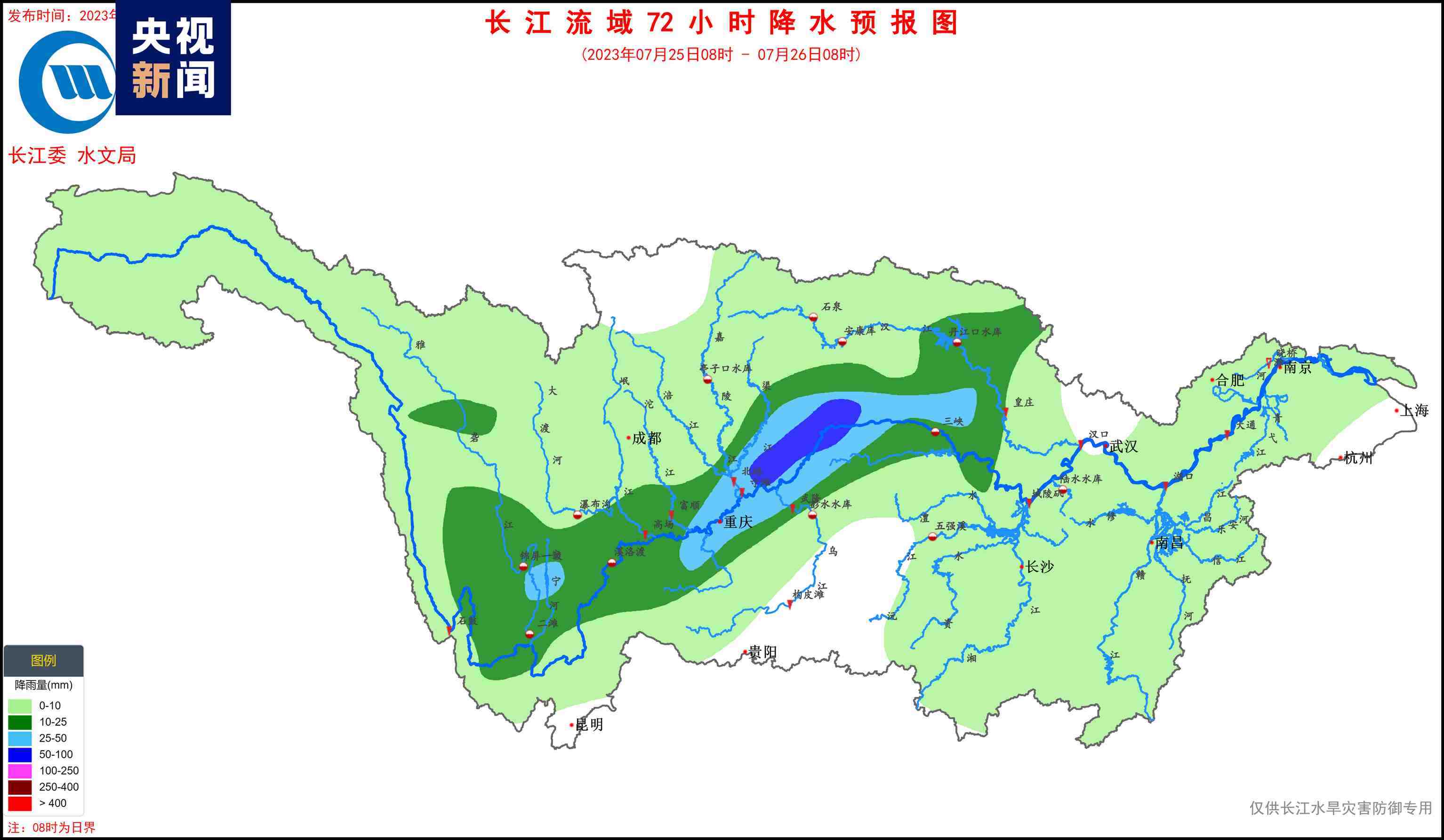 據(jù)水文氣象預(yù)報(bào),7月23日,嘉岷流域北部有中雨、局地大雨;24~27日,長江上游干流附近有中到大雨、局地暴雨的降水過程,過程累計(jì)面雨量:長江上游干流70毫米,金沙江中下游、雅礱江、岷沱江、渠江、烏江上游30~50毫米??紤]預(yù)見期降雨,金沙江中下游、嘉岷流域、赤水河、烏江、三峽區(qū)間將發(fā)生漲水過程,降雨落區(qū)內(nèi)部分中小河流可能發(fā)生超警洪水,局部強(qiáng)降雨引發(fā)山洪災(zāi)害的風(fēng)險(xiǎn)高。