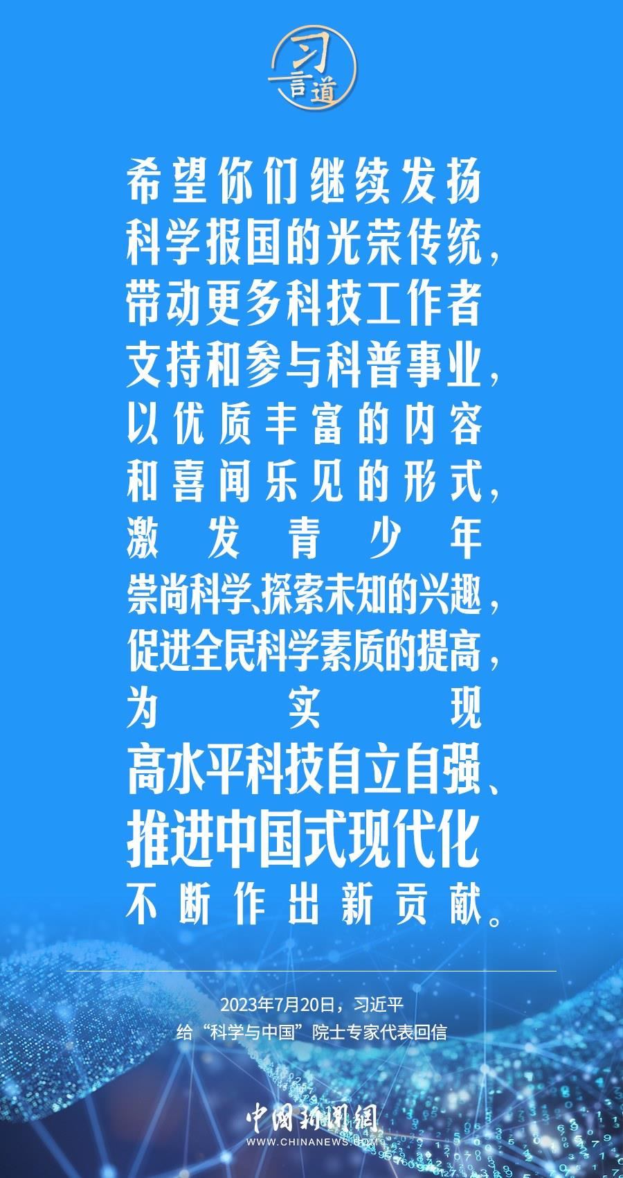 中共中央總書記、國家主席、中央軍委主席習(xí)近平7月20日給“科學(xué)與中國”院士專家代表回信,對科技工作者支持和參與科普事業(yè)提出殷切期望。他指出——