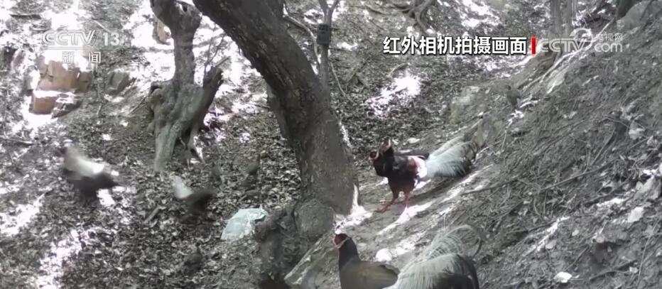 近日,在山西呂梁的孝義市國有林場,紅外相機(jī)記錄到國家一級保護(hù)野生動物褐馬雞最大種群。畫面中,先是兩群褐馬雞在兩棵老樹下覓食玩耍,兩個(gè)樹洞內(nèi)積有雨水,它們不斷地前往飲水補(bǔ)給。突然,一只落單的成年褐馬雞入侵,遭到領(lǐng)地一只雄性褐馬雞的追逐驅(qū)趕。不同角度的紅外相機(jī)還捕捉到褐馬雞好奇對視相機(jī)、幼崽上樹打鬧等趣味十足的珍貴影像。