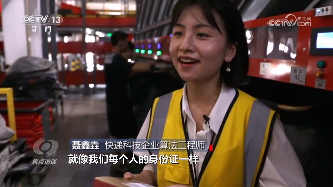 快遞科技企業(yè)算法工程師聶鑫垚:“像這一票件它都有自己的面單,就像我們每個人的身份證一樣,然后上面有一維碼,還有二維碼。當快遞經過一個叫六面掃的設備的時候,就可以把碼掃描出來,這個碼里面會涵蓋快件的生命信息。”