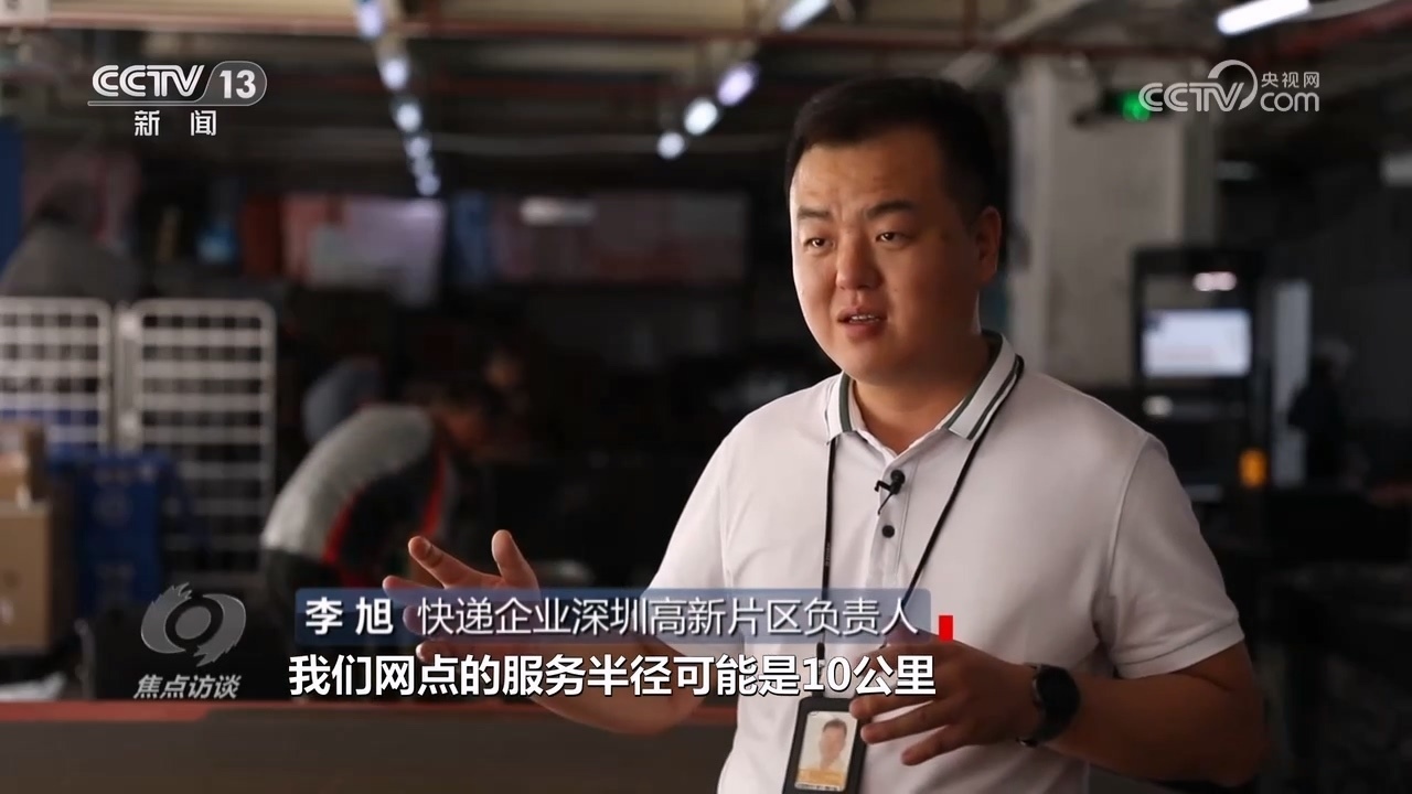 快遞企業(yè)速運深圳高新片區(qū)負責人李旭:“在電子科技化沒有實施的時候,網點服務半徑比較大,往前推十年,網點服務半徑可能是10公里,當年10公里服務半徑和目前2.5公里服務半徑不一樣,當年的時間段比如每天有1萬單,現在一天5萬單,從服務半徑來減少小哥的往返距離,提高收派效率。”