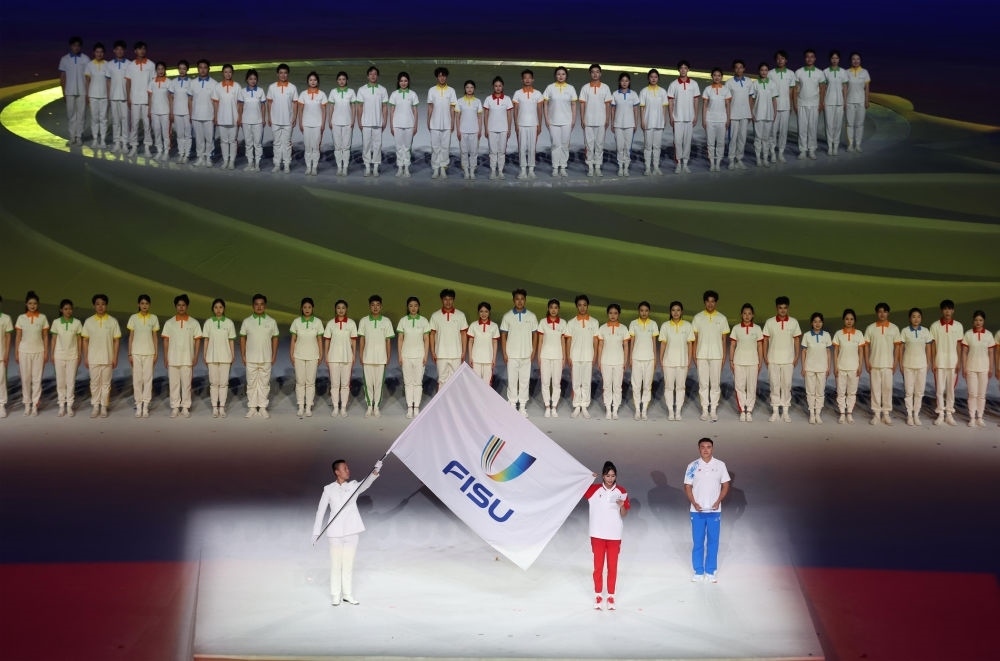 中國大學(xué)生體育代表團(tuán)在開幕式上入場。