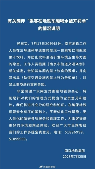 ·南京地鐵通報女子喝水被開罰單:系果汁,依規(guī)出具告知單。