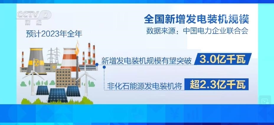 據(jù)預(yù)計,2023年全年,全國新增發(fā)電裝機(jī)規(guī)模有望突破3.0億千瓦,其中,非化石能源發(fā)電裝機(jī)將超過2.3億千瓦。到2023年底,全國發(fā)電裝機(jī)容量預(yù)計將達(dá)到28.6億千瓦,同比增長11.5%左右。其中,并網(wǎng)風(fēng)電和太陽能發(fā)電合計裝機(jī)容量將達(dá)到9.6億千瓦,占總裝機(jī)的三分之一。
