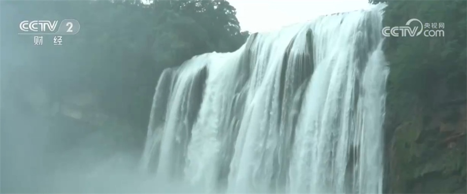 貴州臺記者 龍靜宜:現(xiàn)在黃果樹瀑布的水量非常充足,也是受到了持續(xù)降雨和上游來水的影響,傾瀉而下的瀑布水勢非常浩大,升騰而起的水汽,我現(xiàn)在離它100多米都能夠感覺到水汽在我身旁彌漫。