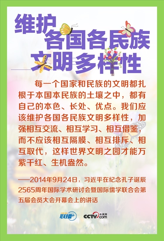 人類文明多樣性賦予這個世界姹紫嫣紅的色彩,多樣帶來交流,交流孕育融合,融合產生進步。長期以來,習近平主席在不同場合多次倡導尊重世界文明多樣性,推動不同文明交流對話、和平共處、和諧共生。讓我們一起來學習。