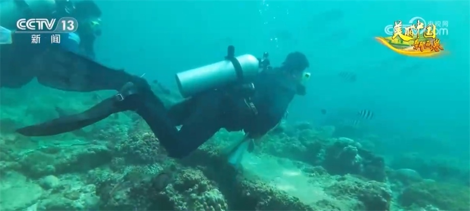 總臺央視記者 焦健:我現(xiàn)在位于海南三亞蜈支洲島,在我身旁的這片海域就是我國的第一個熱帶海洋牧場。這段時間,海洋牧場正在進行珊瑚移植和調(diào)裝魚礁的工作。我們帶著水下攝像機,跟隨著工作人員一起進入海底,體驗在海里如何“植樹造林”。