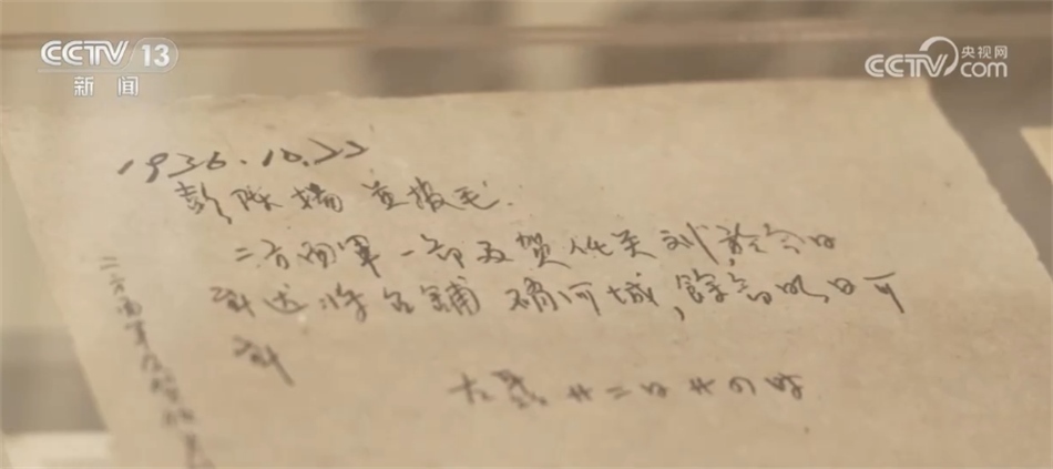六盤山紅軍長征紀(jì)念館館長 李玲:在我們紀(jì)念館里也陳列展出了一組非常珍貴的、紅軍長征過程當(dāng)中的電文,其中有一張就是1936年10月22日,您看在這里,這個(gè)日子也是紅一和紅二方面軍在西吉將臺堡勝利會師的日子。