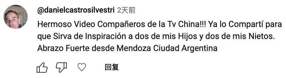 網(wǎng)友danielcastrosilvestri:“中國(guó)電視臺(tái)的朋友們,這個(gè)視頻太好看了?。。∥野阉窒沓鋈?,希望它能夠給我的兩個(gè)孩子和兩個(gè)孫子帶來(lái)啟發(fā)。我來(lái)自阿根廷的門多薩市,致禮?!?/p>