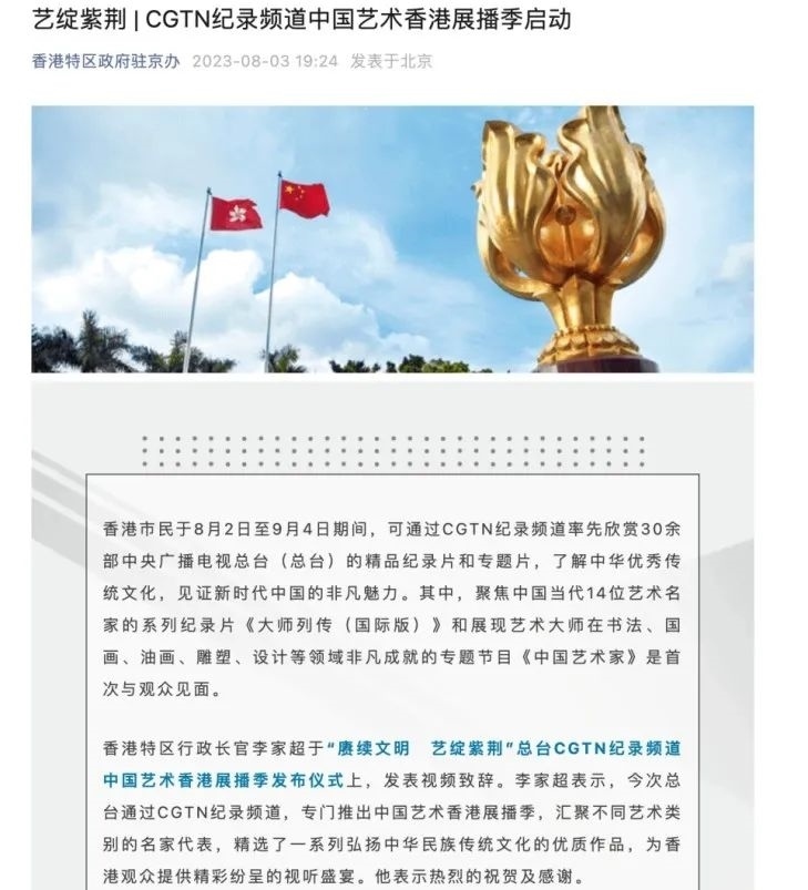 香港特區(qū)政府駐京辦刊文推介中國(guó)藝術(shù)香港展播季